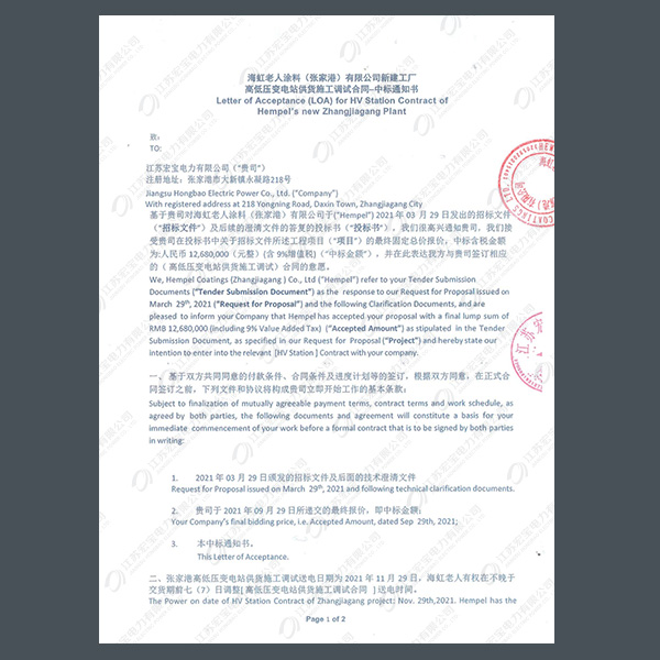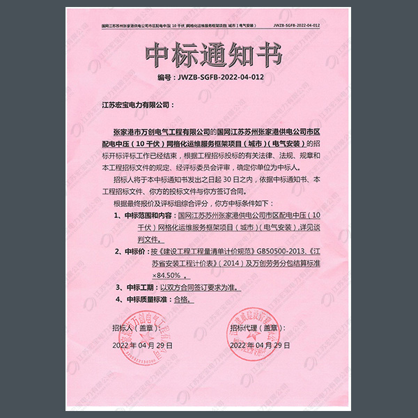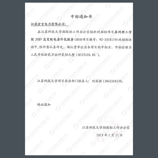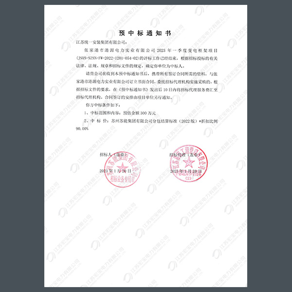 高壓柜中標通知書